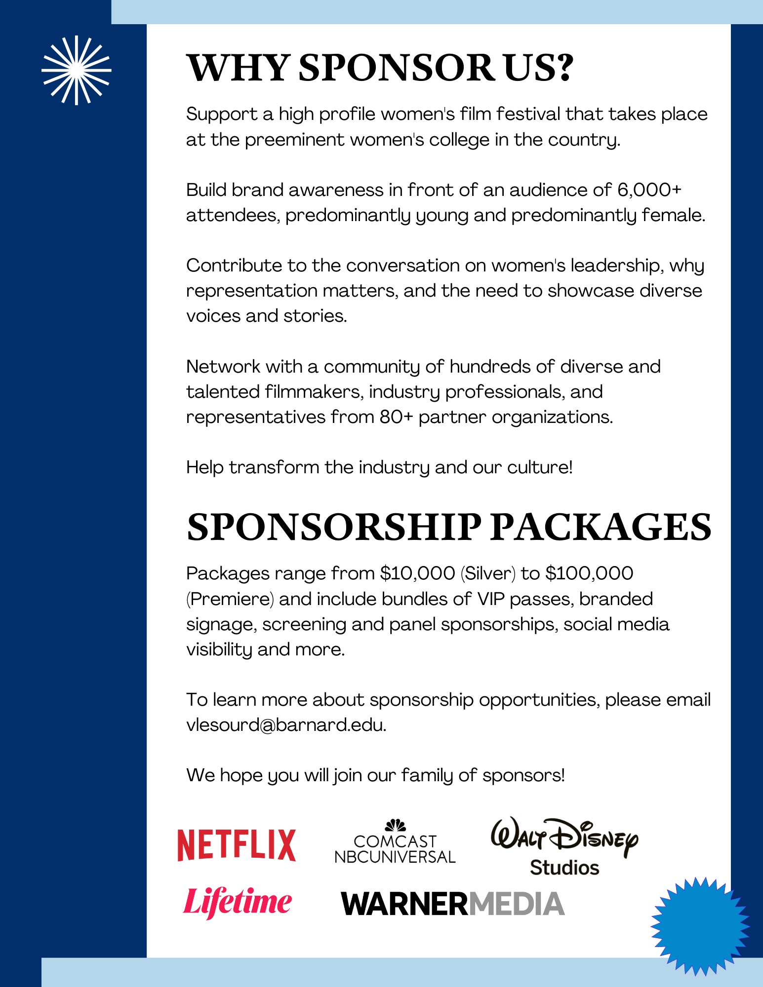 Sponsors of the annual festival include individuals and organizations who contribute at levels between $5,000 and $200,000. Benefits include brand visibility online, in-person, and at the annual festival, bundles of festival passes, opportunities to sponsor dedicated screenings and events, inclusion in press releases, access to our network of hundreds of filmmakers, and an opportunity to connect with thousands of engaged audience members.